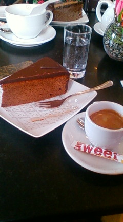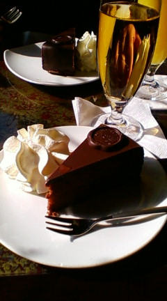 カフェ・デーメルのは、スポンジが軽くてふわふわしています。上のチョコのコーティング層が堅いです。エスプレッソとあいますね。うまい。